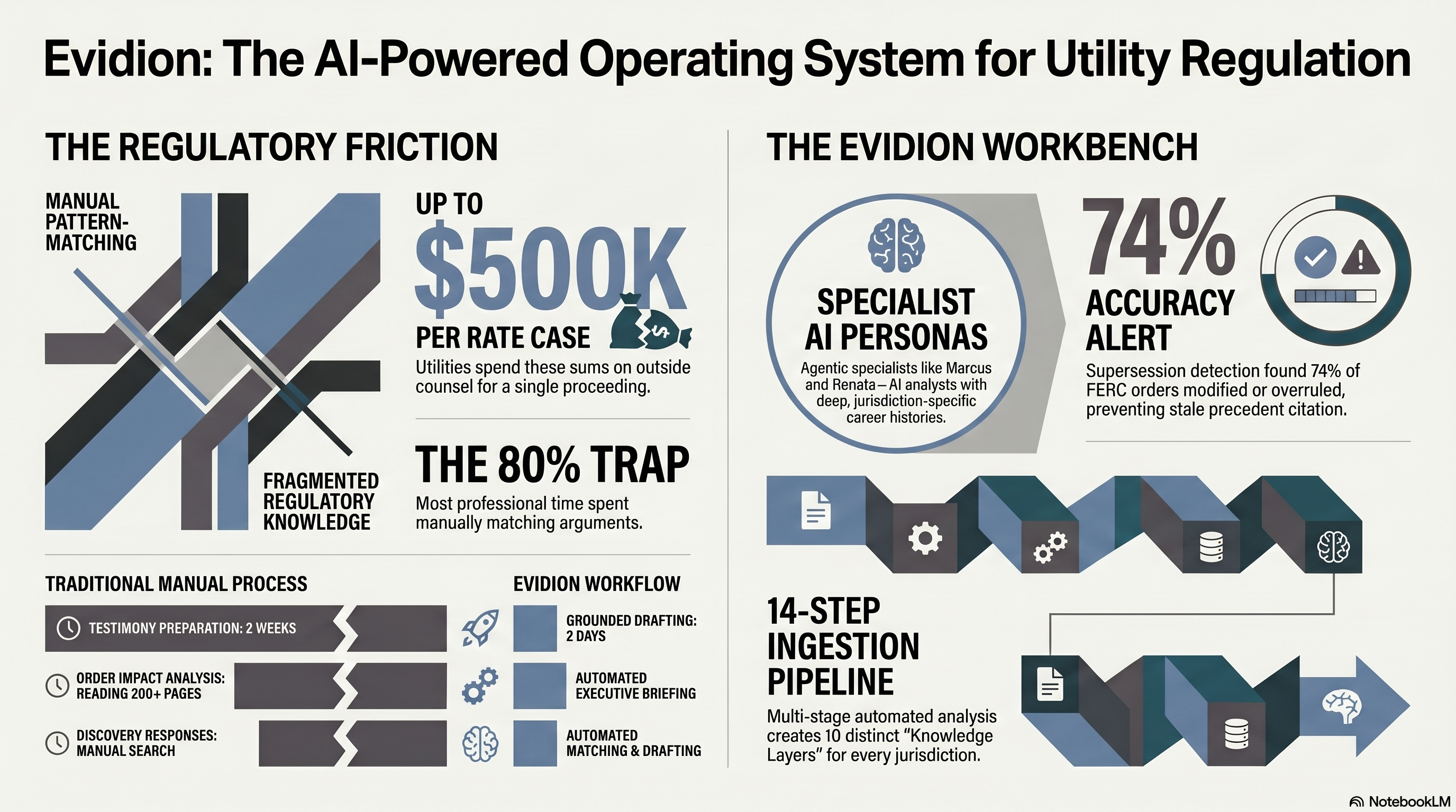 Evidion is the AI-powered regulatory workbench for utility rate case teams. Grounded in your jurisdiction's actual orders, testimony, and filings — not generic legal AI. Every answer cites its source. Every citation links to the page.